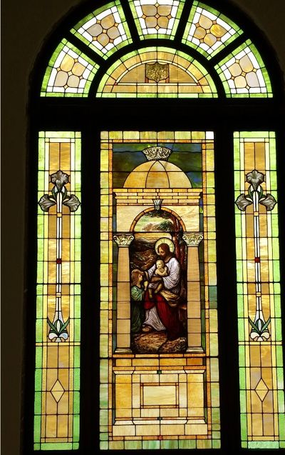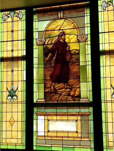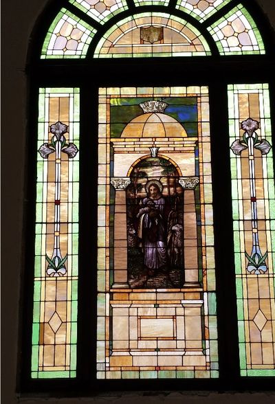 The insurance company considers them not replaceable. In the seventies, we had quite a a bit of damage to the windows from BBs and rocks. One Sunday morning we found a rock lying in the parlor and the hand of the "Sower" in pieces on the floor. We had to hire a company out of the East to repair the damage and to place Lexan over the outside to prevent further vandalism.